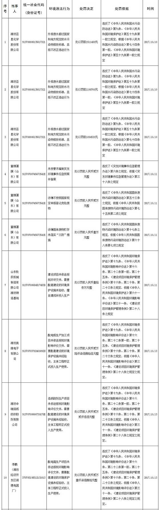 此外,山東中鐵華盛機(jī)械有限公司因需要配套建設(shè)的環(huán)境保護(hù)設(shè)施未驗(yàn)收,主體工程投入生產(chǎn),違反了《建設(shè)項(xiàng)目環(huán)境保護(hù)管理?xiàng)l例》第二十條、二十一條、第二十三條之規(guī)定。企業(yè)被責(zé)令停止生產(chǎn),并罰人民幣伍萬(wàn)元整。濰坊天一環(huán)保科技有限公司因未依法報(bào)批環(huán)評(píng)文件,需要配套建設(shè)的環(huán)境保護(hù)設(shè)施未驗(yàn)收,擅自建成并投入生產(chǎn),違反了《中華人民共和國(guó)環(huán)境保護(hù)法》第十九條、《中華人民共和國(guó)環(huán)境影響評(píng)價(jià)法》第十六條、第二十二條第一款、第二十五條、《建設(shè)富維薄膜(山東)有限公司因未按要求編制突發(fā)環(huán)境事件應(yīng)急預(yù)案并備案處以罰款人民幣貳萬(wàn)元整、涉嫌不按照國(guó)家規(guī)定申報(bào)登記危險(xiǎn)廢物處以罰款人民幣貳萬(wàn)元整、涉嫌固體廢物貯存未落實(shí)“三防”措施處以罰款人民幣壹萬(wàn)元整;山東秋辰機(jī)械制造有限公司濰坊鑄造基地因建設(shè)項(xiàng)目未依法報(bào)批環(huán)評(píng)文件,需要配套建設(shè)的環(huán)境保護(hù)設(shè)施未驗(yàn)收,擅自建成并投入生產(chǎn),處以罰款人民幣壹拾叁萬(wàn)元整;濰坊奧維電子有限公司因配電柜生產(chǎn)加工項(xiàng)目未依法報(bào)批環(huán)境影響評(píng)價(jià)文件,需要配套建設(shè)的環(huán)境保護(hù)設(shè)施未經(jīng)驗(yàn)收,主體工程即正式投入生產(chǎn)使用,處以罰款人民幣貳萬(wàn)陸仟柒佰捌拾伍元整;濰坊中瑞造紙紡織助劑有限公司因造紙助劑生產(chǎn)項(xiàng)目未依法報(bào)批環(huán)境影響評(píng)價(jià)文件,需要配套建設(shè)的環(huán)境保護(hù)設(shè)施未經(jīng)驗(yàn)收,主體工程即正式投入生產(chǎn)使用,處以罰款人民幣貳萬(wàn)貳仟伍佰元整;李鵬(濰坊經(jīng)濟(jì)開(kāi)發(fā)區(qū)潤(rùn)德電器廠)因配電箱生產(chǎn)項(xiàng)目未依法報(bào)批環(huán)境影響評(píng)價(jià)文件,需要配套建設(shè)的環(huán)境保護(hù)設(shè)施未經(jīng)驗(yàn)收,主體工程即正式投入生產(chǎn)使用,處以罰款人民幣貳萬(wàn)壹仟柒佰捌拾元整;濰坊紅柳機(jī)械開(kāi)發(fā)有限公司因拖拉機(jī)組裝項(xiàng)目未依法報(bào)批環(huán)境影響評(píng)價(jià)文件,需要配套建設(shè)的環(huán)境保護(hù)設(shè)施未經(jīng)驗(yàn)收,主體工程即正式投入生產(chǎn)使用,處以罰款人民幣叁萬(wàn)壹仟貳佰元整;壽光福麥斯輪胎有限公司因排放大氣污染物超過(guò)國(guó)家和地方規(guī)定的排放標(biāo)準(zhǔn),處以罰款人民幣壹拾萬(wàn)元整。